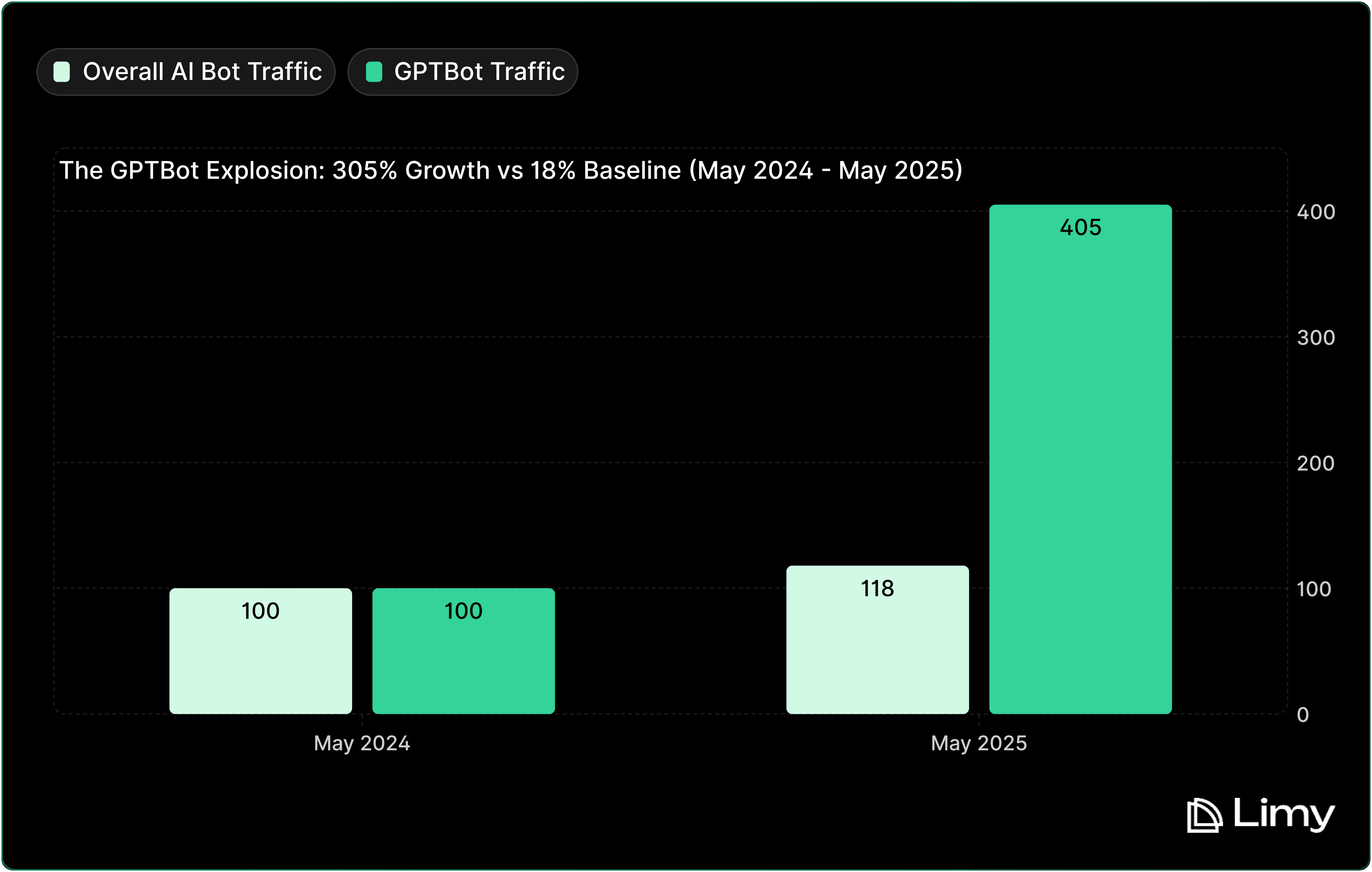 From May 2024 to May 2025, AI bot traffic grew by 18% overall, with some individual crawlers showing explosive growth rates exceeding 300%. GPTBot alone jumped 305% in the same period. This isn't slowing down. It's accelerating. And the brands who understand bot behavior now are the ones who'll dominate GEO and AEO for the next decade.