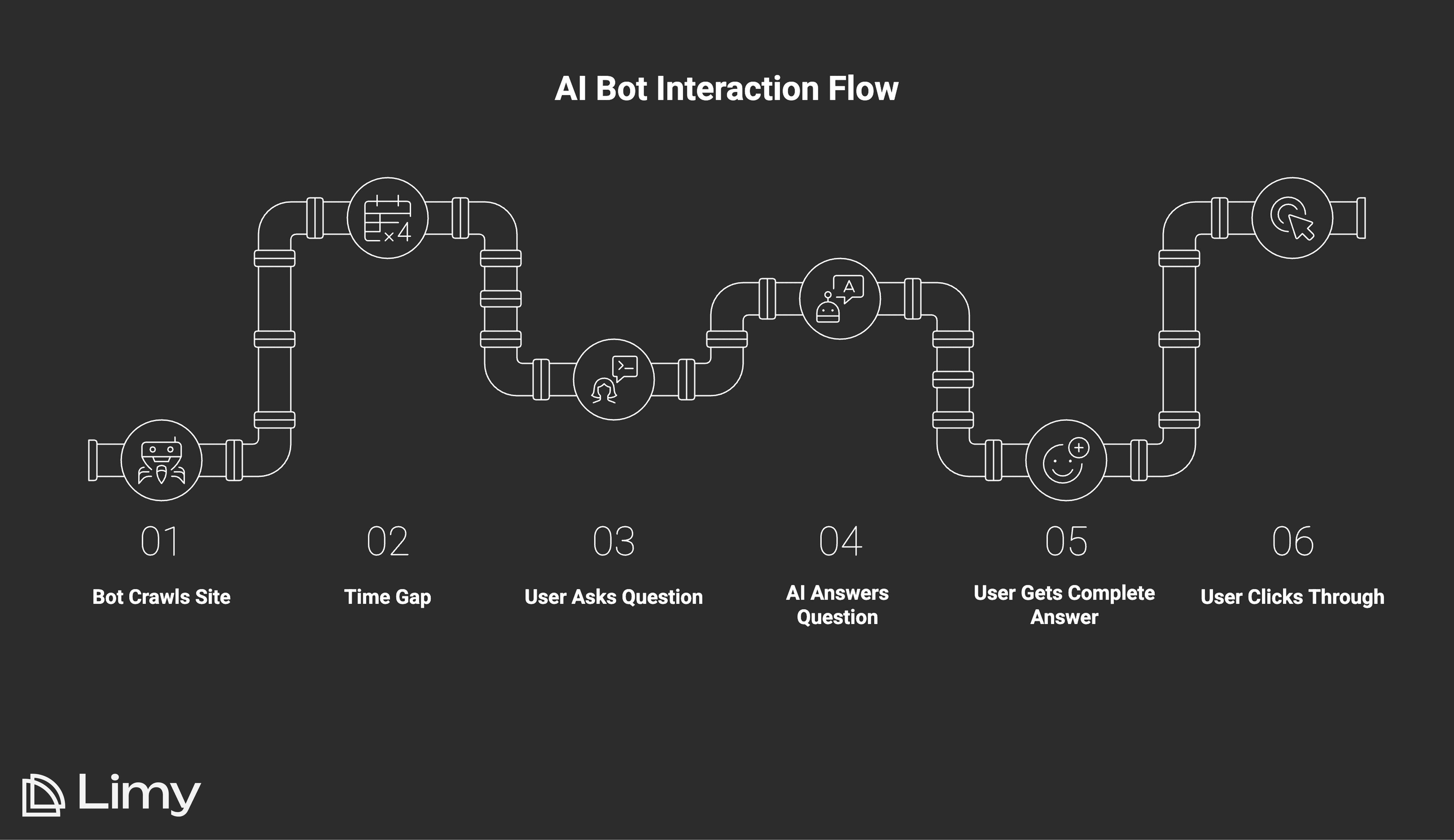 The reason is simple: people don't visit your site anymore. They ask ChatGPT, Claude, or Perplexity a question, and those systems decide what information to surface based on what their bots have already crawled from you. When someone asks "what's the best project management software for remote teams," they're not clicking through ten websites. They're reading an AI-generated answer that synthesizes your content, your competitor's content, and everything in between. The bot's interpretation became their reality. You never got the visit. You never got the conversion. You just got crawled. And if the bot didn't prioritize your key differentiators or pricing advantages when it scraped you last month, you've already lost that customer without ever knowing they existed.
