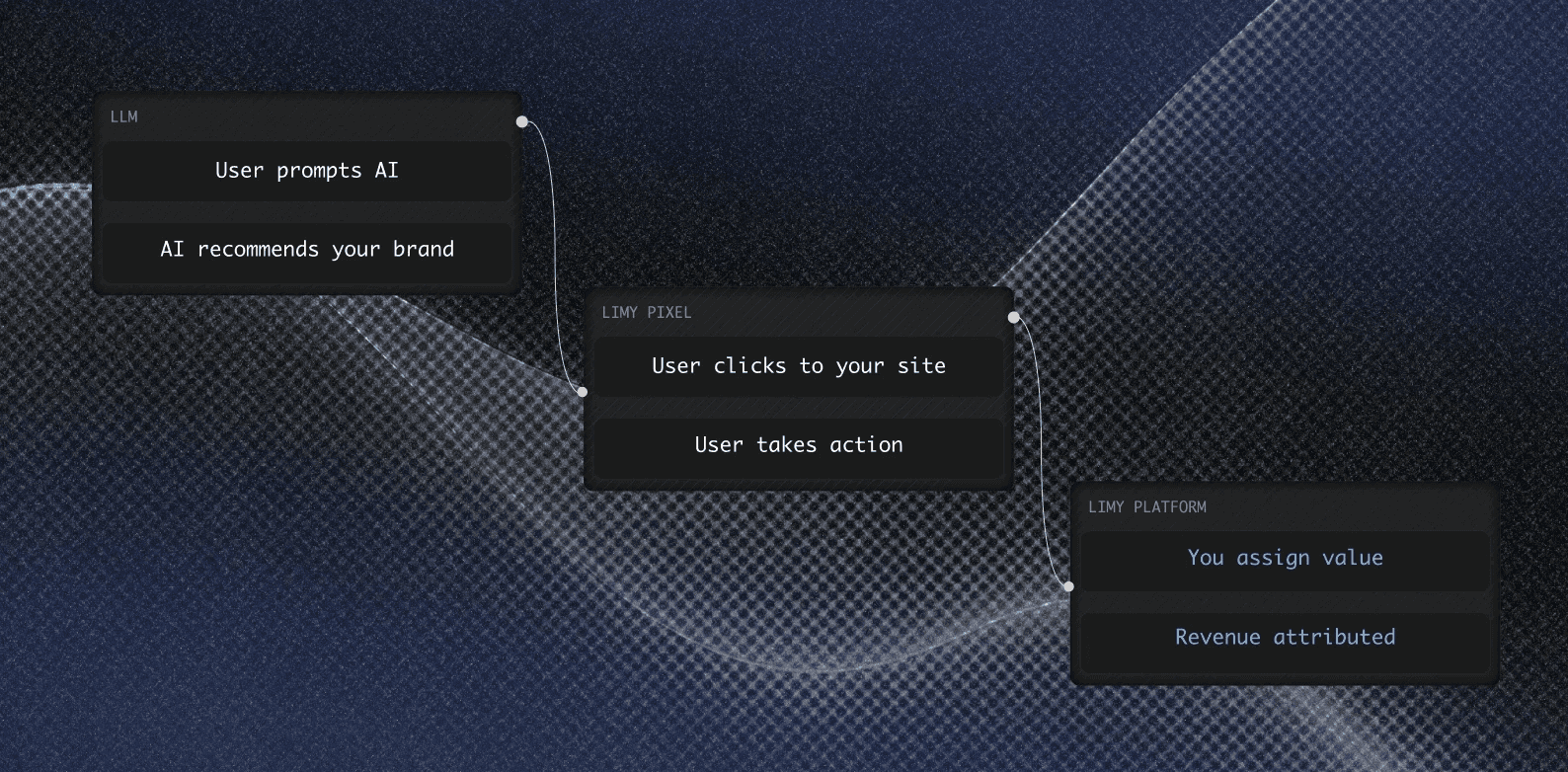 Limy Attribution connects every AI-powered interaction back to a real business outcome. For the first time, you can track the full customer decision making journey in the agentic web, from the initial prompt, to the AI’s response, to what the user actually did, and to the revenue that action generated.